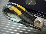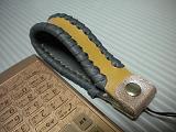 表面は、和紙のようなデザインの淡いイエローレザーを使用しました。 内側とトップの部分、周囲のかがりは、ライトブルーレザーを使用して、仕上げています。 ストラップひもは、ブラックを使用。 *携帯電話は、付属致しません。 |