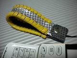 表面は、細かい四角で、チェック柄をデザインした、型押しシルバーレザーを使用しています。 内側は、艶消しブラックレザーを使用しました。 トップの部分は、グレースエードレザーに、ドットのプリント加工が、施してあるものを使用しています。 周囲は、イエローレザーで、かがり仕上げをしました。 ストラップひもは、ブラックを使用。 *携帯電話は、付属致しません。 |