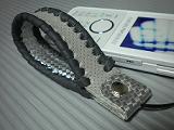 表面は、ブラックベースに、グレーメタリックの斑点があるデザインレザーを使用。 内側とトップの部分は、細かい四角で、チェック柄を表現した、型押しシルバーレザーを使用しました。 周囲の部分は、ピンクの入ったレッドレザーで、かがりをして、仕上げました。 ストラップひもは、ブラックを使用。 *携帯電話は、付属致しません。 |
