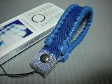 表面は、編み込みデザインを型押しをした、ダークブルーのレザーを使用しました。 内側は、メタリックブルーのレザーをベースに、レース生地を貼りつけた加工のレザーを使用しました。 トップの部分と周囲のかがりは、ライトブラウンのレザーを使用しています。 ストラップひもは、ブラックを使用。 *携帯電話は、付属致しません。 |