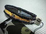 | 説明 | 本体部分の両端をかしめ打ちをして、レザーをつなぎ、ストラップにしています。 表面の本体側は、ブラウンレザーに、ゴールドの大きなドットをプリント加工したものを使用しています。 表面のトップ側は、編み込みデザイン型押しのブラックレザーを使用しました。 内側の本体側は、メタルシルバーレザーを使用。 内側のトップ側は、ブラックレザーを使用しています。 ストラップ周囲は、ブラックレザーで、かがり仕上げをしました。 ストラップひもは、ブラックを使用。 *携帯電話は、付属致しません。 |