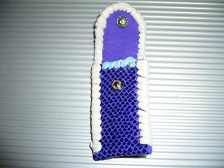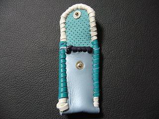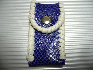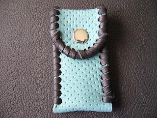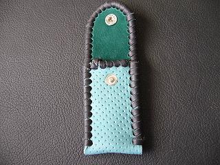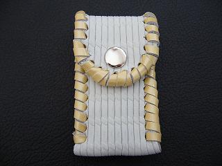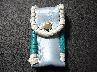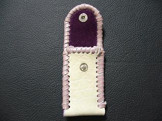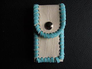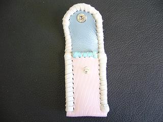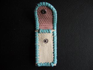 ホワイトのクロコ型押しレザーに、スカイブルーの革ひもで、かがりました。 かがりは、全体的に端部をかがっています。 内側は、ピンクの型押しレザーを使っています。 |