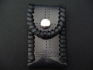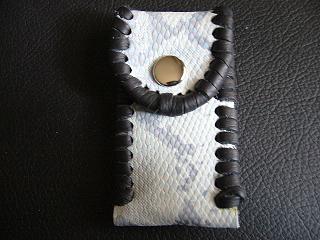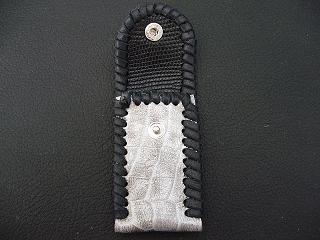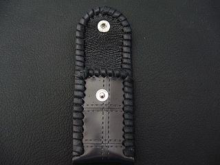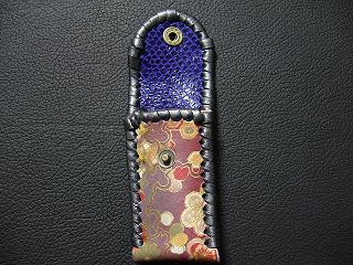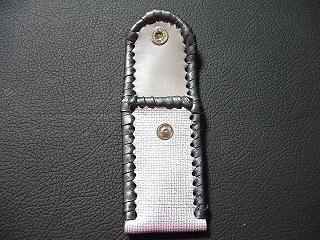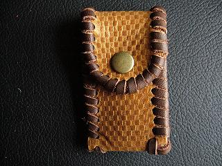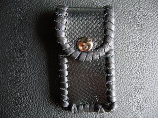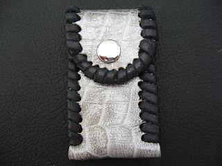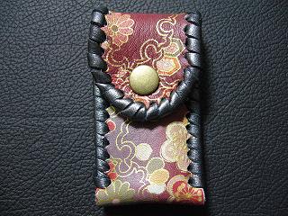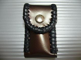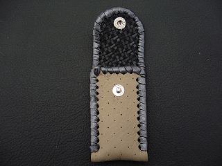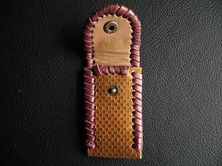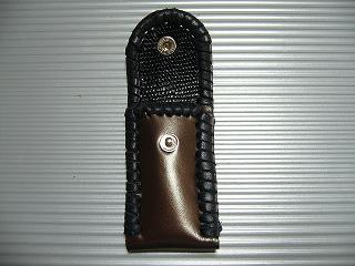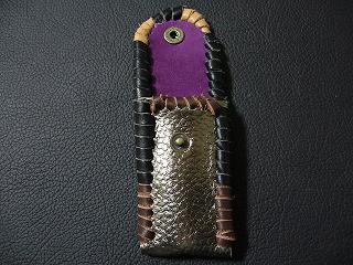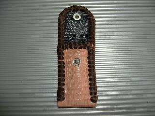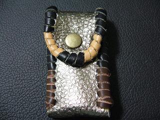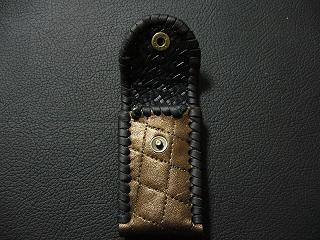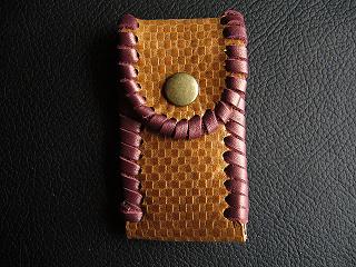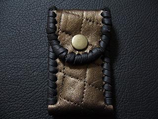 ブラウンメタリックのレザーを使い、周囲は、ブラックの革ひもかがりです。 内側のレザーは、トカゲ柄の型押しをしたブラックレザーレザーです。 |