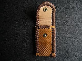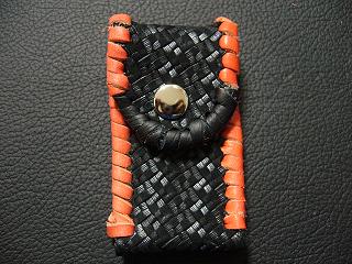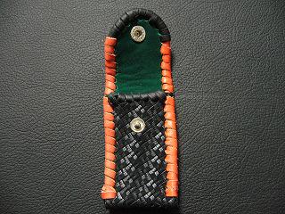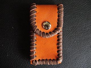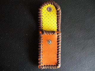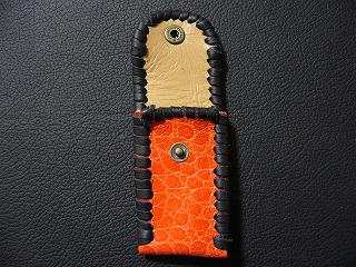 オレンジに染色したレザーに、周囲をブラウンの革ひもで、かがって仕上げています。 内側は、イエローのパンチングレザーを使用しています。 |