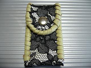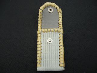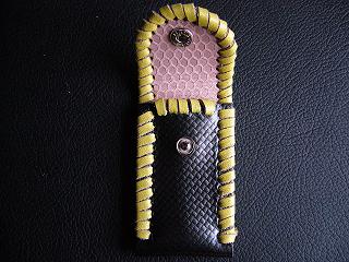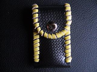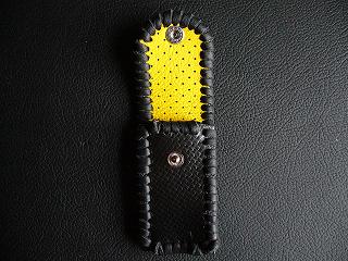 ブラックメタリックでチェックの型押し加工をしたレザーを使い、周囲は、ブラックの革ひもかがりです。 内側のレザーは、イエローパンチングのレザーです。 |