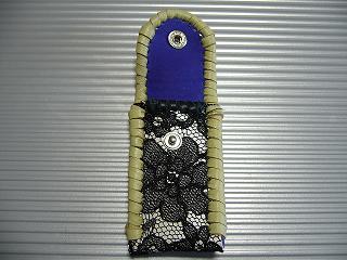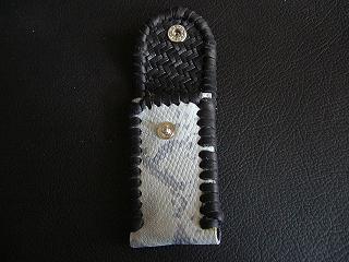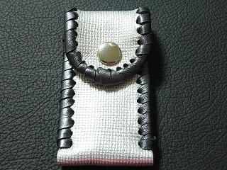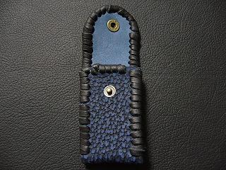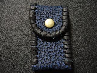 クロコ柄型押しのシルバーレザーを使用し、周囲をブラックの革ひもでかがりました。内側は、トカゲ柄型押しのブラックレザーです。 | 四角を基本として、ステッチの入ったようなデザインの型押しのダークブルーのレザーを使用。周囲をブラックの革ひもでかがっています。内側は、トカゲ柄の型押しブラックレザーを使用しています。 |