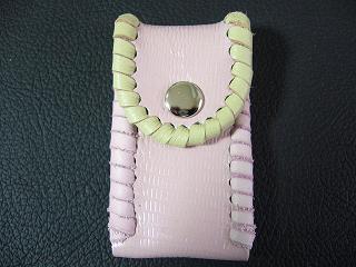 | 説明 | 表面は、クロコ柄型押しでパール発色のあるピンクのレザーを使い、周囲は、左右をローズピンクの革ひも、蓋部分は、若草色の革ひも、内側の端部は、モカの色合いの革ひもかがりで仕上げています。 内側のレザーは、ライトグレーのレザーです。 |