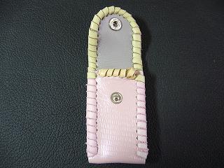 | 説明 | 表面は、パール発色のあるレッドレザーを使用しています。内側は、籐細工のような立体感のある型押し柄のブラックレザーを使用。周囲は、ピンクの革ひもでかがって仕上げています。 | 表面は、ベイジュパンチングレザー(穴貫通)を使用しています。内側は、籐細工のような立体感のある型押し柄のブラックレザーを使用。周囲は、グレーメタリックの革ひもを使用して、かがって仕上げています。 | 表面は、スネーク柄型押しのレザーで、ブルー系の色合いで、鱗の色合いを表現したものです。内側は、籐細工のような立体感のある型押し柄のブラックレザーを使用。周囲は、ブラックの革ひもを使用して、かがって仕上げています。 | 表面は、パール発色のあるライトブルーレザーを使用。内側は、ライムグリーンのパンチングレザー(穴非貫通)を使用しています。周囲は、グリーン、ホワイト、パープルメタリックの革ひもでかがって仕上げています。グリーンの革ひもは、太いものを使って、部分的に、立体感を出しています。 |