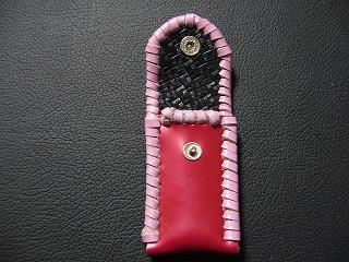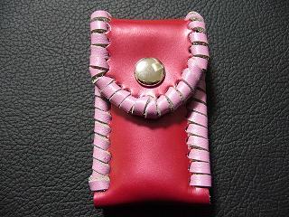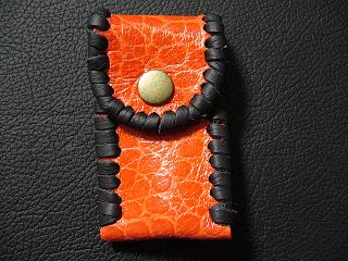 | 説明 | クロコ柄型押しのオレンジピンクのレザーを使い、周囲は、ブラウンの革ひもかがりです。 内側のレザーは、トカゲ柄型押しのブラックレザーです。 |