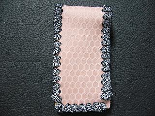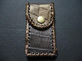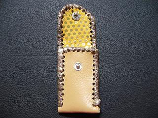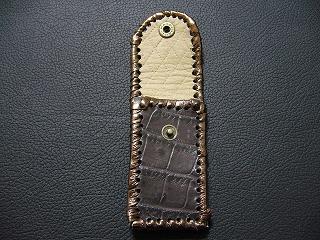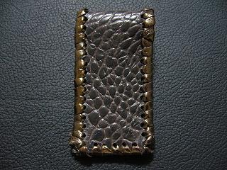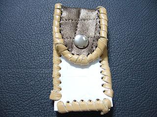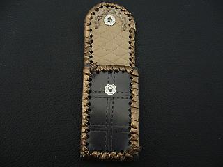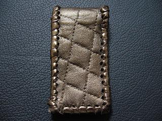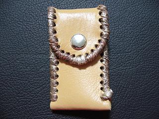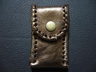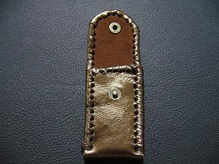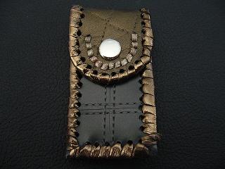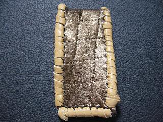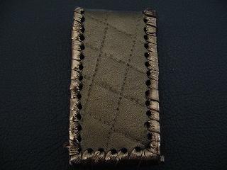 表面は、ブロンズカラーのレザーを使用しています。 内側は、ベージュのソフトレザーで、クロスステッチを入れたようなデザインを型押しをしたものです。周囲は、モカの色合いの革ひもで、かがって仕上げています。 スナップのボタンは、光沢のあるクロムを使用しています。 |