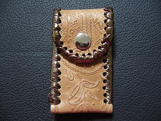 | 説明 | 表面の正面側は、リーフ柄デザインを型押ししたブラックレザーを使用しています。 表面の蓋から後ろ側にかけては、ブロンズカラーのレザーを使用。 内側は、ベージュのパンチングレザーを使用しました。 周囲は、モカの色合いの革ひもで、かがり仕上げをしています。 スナップのボタンは、光沢のあるクロムを使用しています。 |