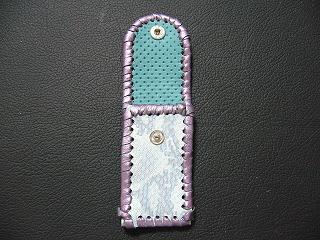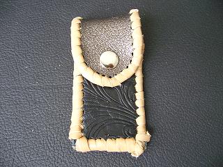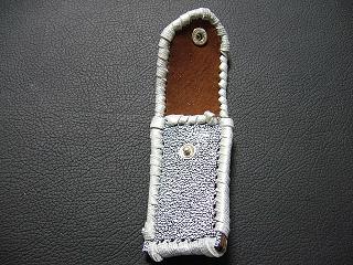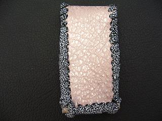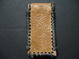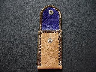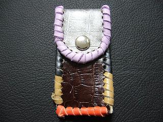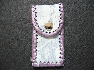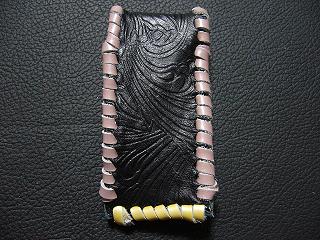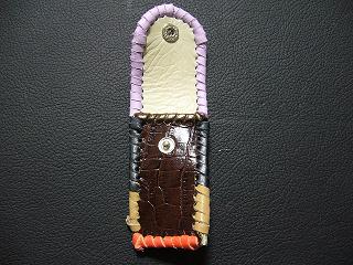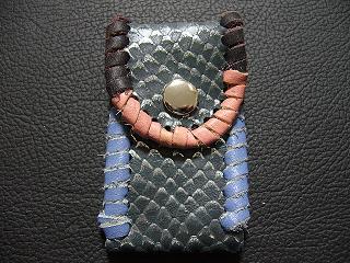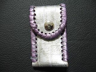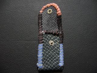 表面は、ブルースネークをデザインした型押しのレザーを使用しています。 内側は、ペパーミントグリーンのパンチングレザーを使用しました。 周囲は、パープルメタリックの革ひもで、かがり仕上げをしています。 |
