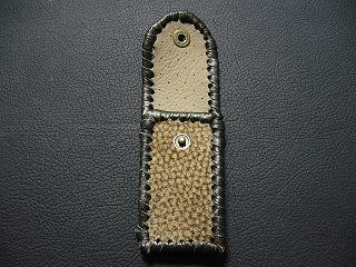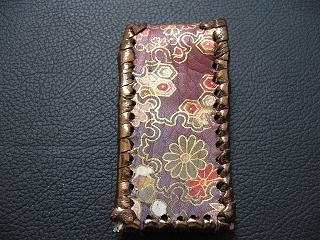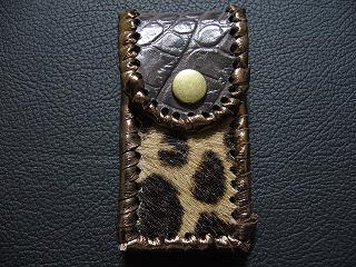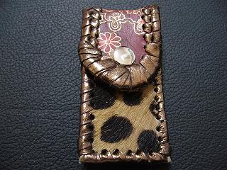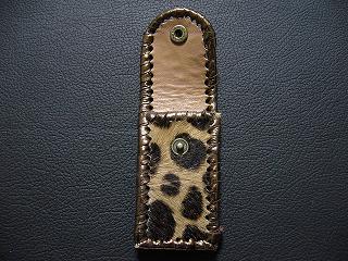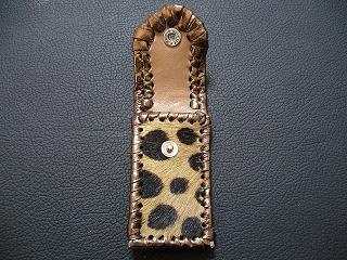 | 説明 | 表面の正面側は、斑点模様で毛足の短いフェイクファーを使用しています。 表面の蓋から後ろ側については、レザーに、着物のような和柄をデザインしたものを使用。 内側は、ライトブラウンのレザーを使用しました。 周囲は、ゴールドの革ひもで、かがって仕上げています。 蓋の部分については、革ひもをダブルにかがりを行いサイドは、内側にゴールドのラインができるようにかがりで装飾しています。 スナップのボタンは、光沢のあるクロムを使用しています。 |