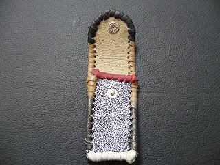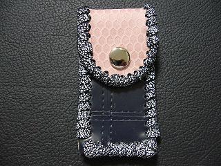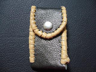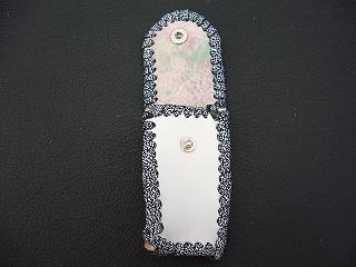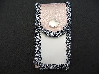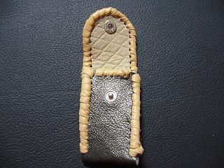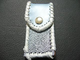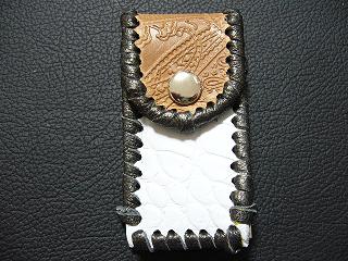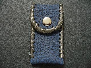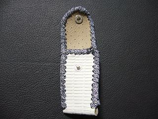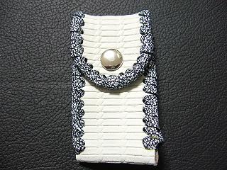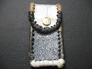 | 説明 | 表面の正面側は、ブラックをベースに、ホワイトを細かくまだらに配置したデザインのレザーを使用しています。表面の蓋から後ろ側にかけては、ライトブルーのレザーを使用しました。 内側は、ブラウンのスエードレザーを使用しています。 周囲は、クロスデザイン型押しのシルバーレザーをカットして、革ひもにしたもので、仕上げています。 スナップのボタンは、光沢のあるクロムを使用しています。 |
