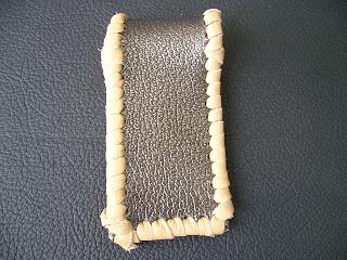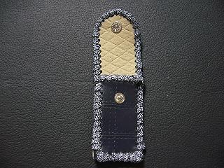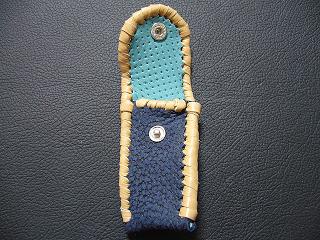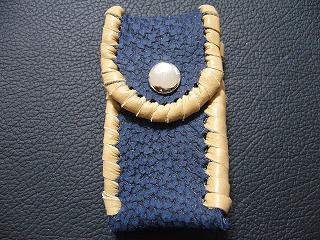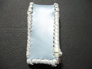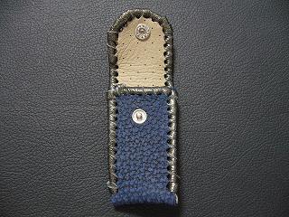 表面は、ダークブルーのレザーで、シボ(皺感)を粗く出した加工が施されているものを使用しています。 内側は、ペパーミントグリーンのパンチング(穴非貫通)レザーを使用しました。 このレザーは、ソフトで、肌触りがいいレザーです。 周囲は、モカの色合いの革ひもで、かがって仕上げています。 |