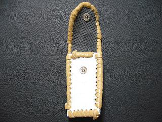 | 説明 | 表面は、モカの色合いのレザーを使用しています。内側は、イエローがかったオレンジのバックスキンで、ゴールドの水玉プリント加工が施してあるレザーを使用。 周囲は、ブラウンカラーをベースに、シルバー系のカラーでまだらにぼかしたデザインのレザーをカットし、革ひもにしたもので、かがり仕上げをしています。 |