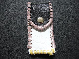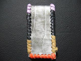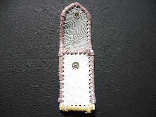 表面は、ホワイトクロコ柄型押しのレザーを使用。 内側は、ホワイトをベースに、ピンク、グリーンのカラーをまだらにぼかし染めをしたレザーを使用。 周囲は、シルバーメタリックの革ひもで、かがり仕上げをしています。 |
