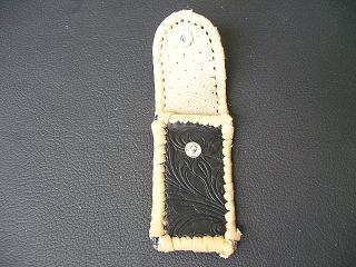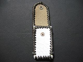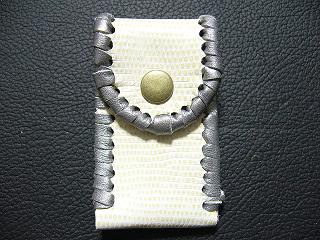 表面は、等間隔に横溝が入ったデザインを型押しをしたホワイトレザーを使用しています。 内側は、ベージュパンチングレザーを使用。 周囲は、ブラックをベースに、ホワイトを細かくまだらに、配置をしたデザインのレザーをカットし、革ひもにしたものをかがり仕上げしています。 スナップのボタンは、光沢のあるクロムを使用しています。 |