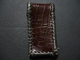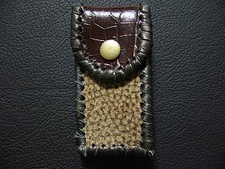 表面の正面側は、ベージュのバックスキンに、ブラウンのカラーで、まだらに染めたデザインのレザーを使用しています。 表面の蓋から後側にかけては、光沢のあるブラウンカラーで、クロコ柄を型押ししたレザーを使用しました。 内側は、ベージュのパンチングレザーを使用。 周囲は、ブロンズカラーの革ひもで、かがり仕上げをしています。 |