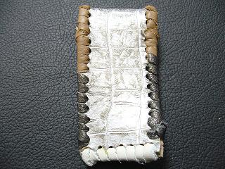 表面は、ライトブラウンの色合いで、草木をデザインした型押しレザーを使用しています。 内側は、パープルレザーに、鱗の柄をプリント加工を施したレザーを使用しています。 周囲は、ゴールドの革ひもで、かがって仕上げています。 |