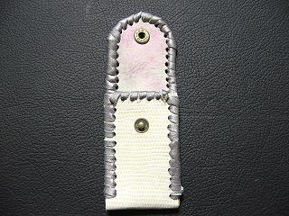 | 説明 | 表面の正面側は、パール発色のあるホワイトレザーを使用しています。 表面の蓋から後ろ側にかけては、アルミカラーにピンクのカラーをのせた色合いのレザーを使用。 内側は、ピンク、グリーンなどのカラーをぼかして染めたレザーを使用しています。 周囲は、ブラックをベースに、ホワイトのカラーを細かくまだらにデザインをしたレザーをカットして、革ひもにしたもので、かがり仕上げをしています。 スナップのボタンは、光沢のあるクロムを使用しています。 |
