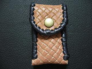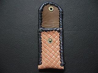 表面は、編み込み柄デザインを型押しをした赤みのあるオレンジレザーです。 内側は、ライトブラウンのレザーを使用しています。 周囲は、ブラックメタリックの革ひもで、かがり仕上げをしています。 スナップボタンは、ブロンズ色で、光沢感を抑えたものを使用しています。 |