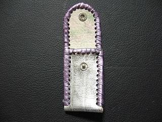 表面は、クロコ柄型押しのシルバーレザーを使用しています。 内側は、ホワイトをベースに、グリーンやピンクを淡くぼかし染めたレザーを使用しました。 周囲は、パープルメタリックの革ひもで、かがり仕上げをしています。 |