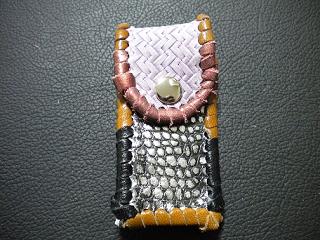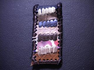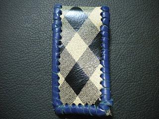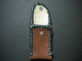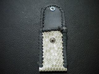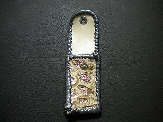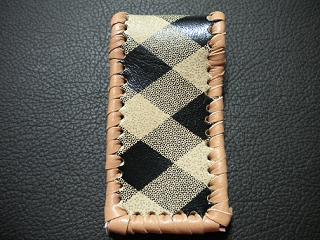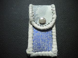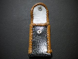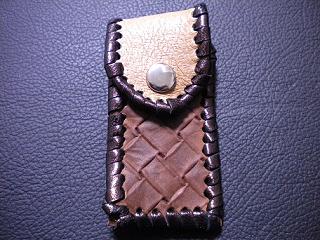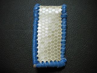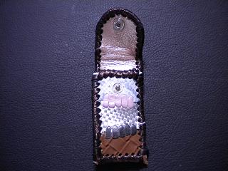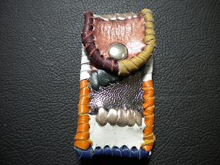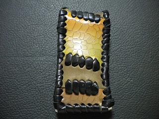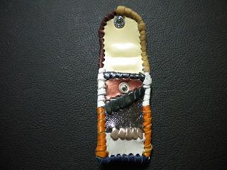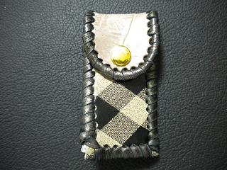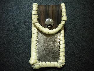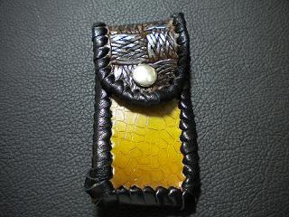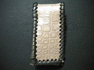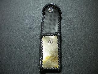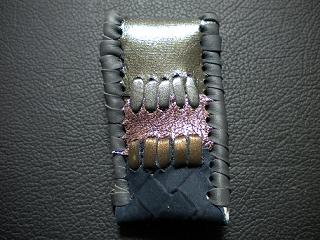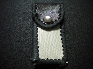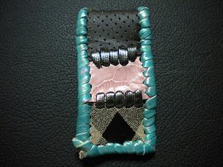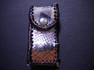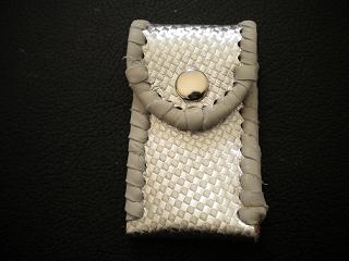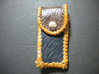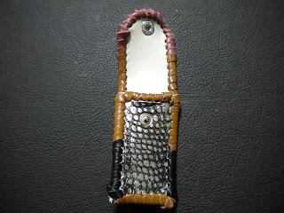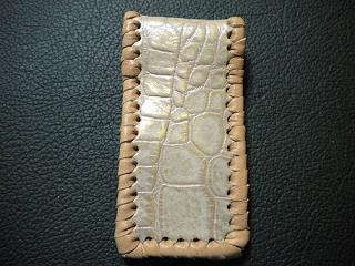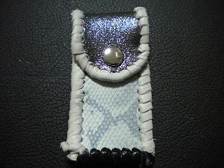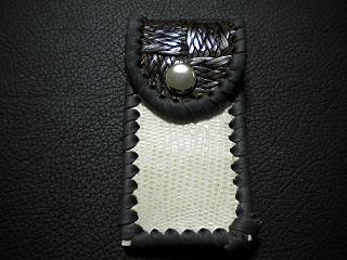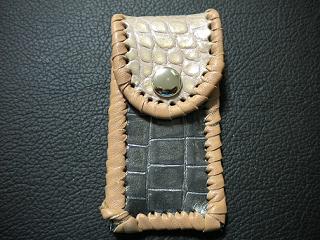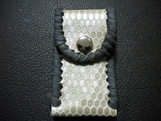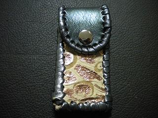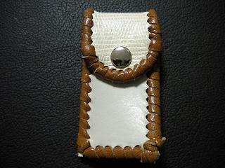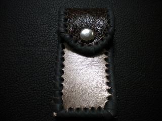 ケースの表面は、2種類のレザーをブラックレザーでかがって、パッチワーク調につないで使用しています。 レザーは、海蛇カラーの型押しレザーとアッシュブラウンカラーのレザーの2種類を使用しました。 ケースの内側は、シルバーベースに、ホワイトのメッシュデザインを型押しをしたレザーを使用しました。 ケース周囲は、ブラックレザーで、かがりをして、仕上げました。 |