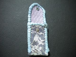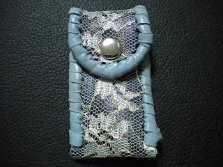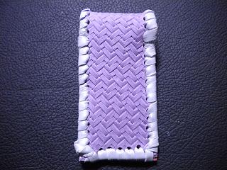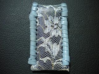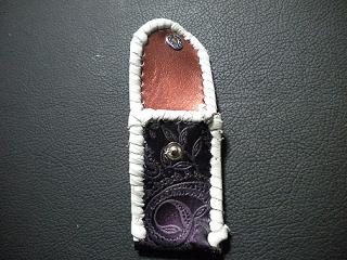 表面は、ブルーメタリックのレザーに、花柄レース生地を貼りつけ加工してある特殊レザーを使用しています。 内側は、籐細工のような編み込みデザインを型押しをした、パープルレザーを使用しています。 ケース周囲は、ライトブルーのレザーで、かがりをして仕上げました。 |