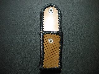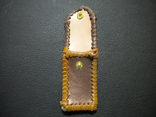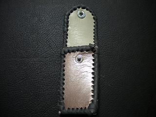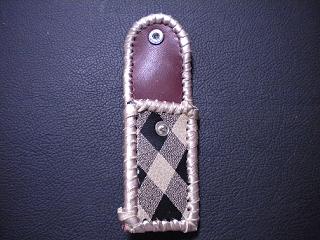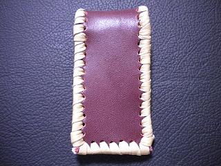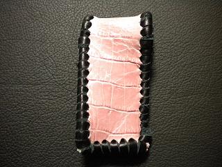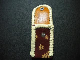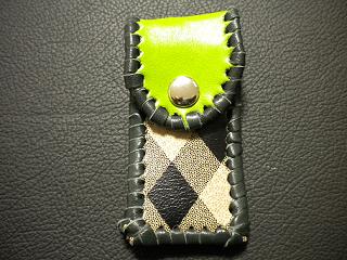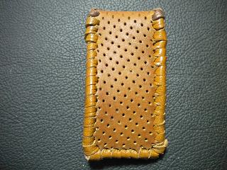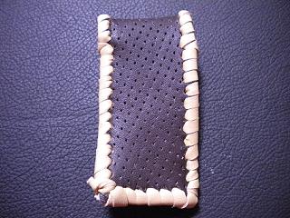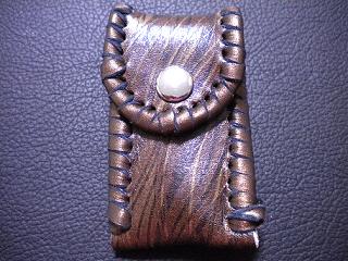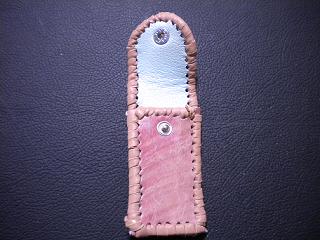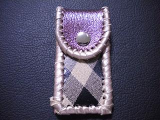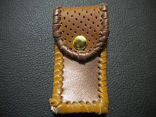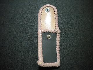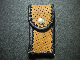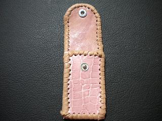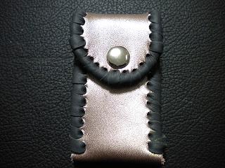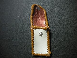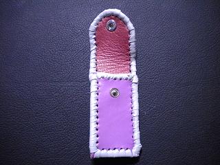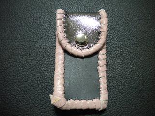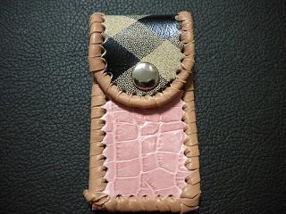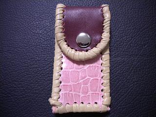 表面は、ライトブラウンパンチングレザーを使用。 内側は、ライトピンクレザーを使用しました。 ケース周囲は、ブラックレザーで、かがり仕上げをしました。 |