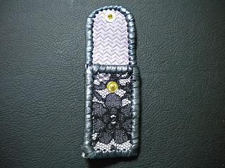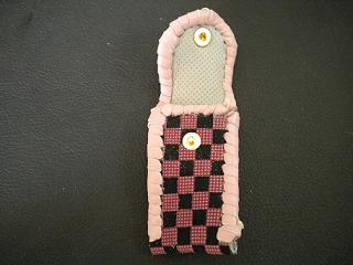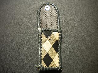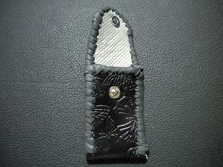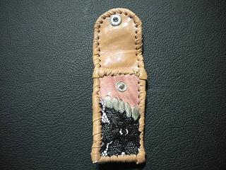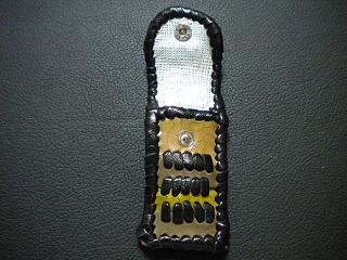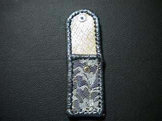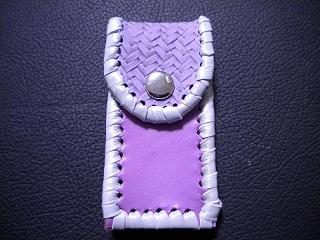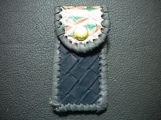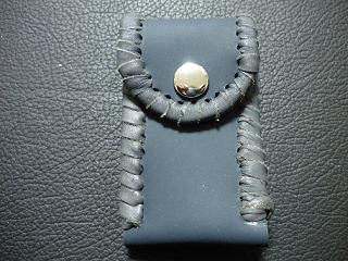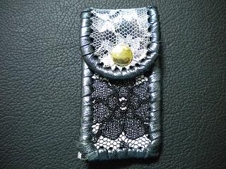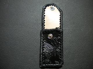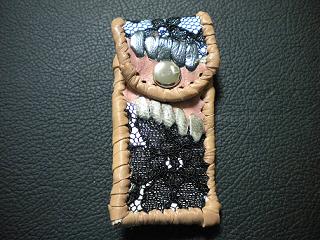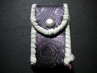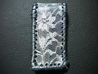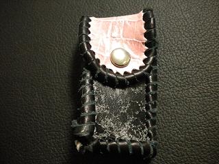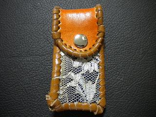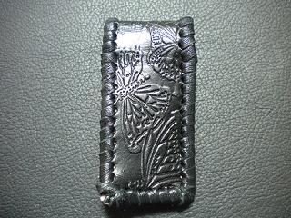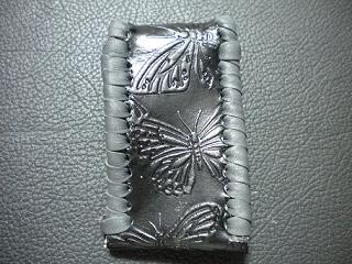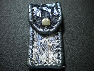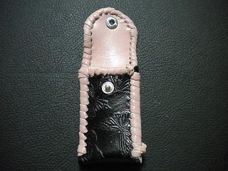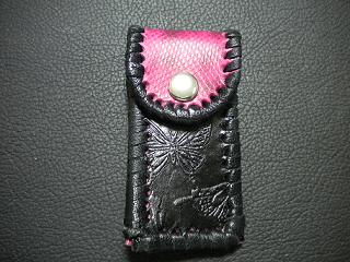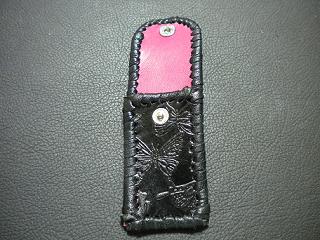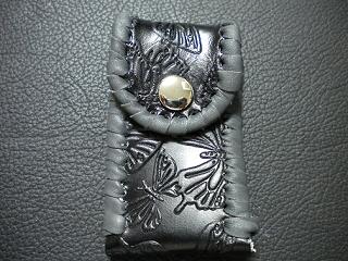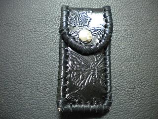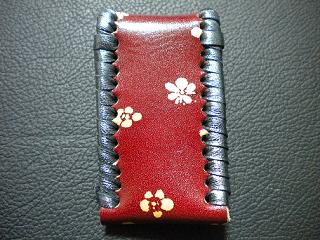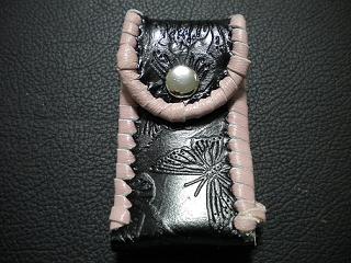 表面は、蝶のデザインを型押した、ブラックレザーを使用。 内側は、ライトピンクレザーを使用。 ケース周囲は、ブラックレザーで、かがり仕上げをしました。 |