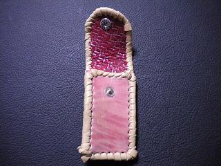 表面は、樹皮のようなデザインを型押しをした、ブラウンレザーを使用しています。 内側は、ピンクのカラーをまだらに、ぼかしたデザインのレザーを使用しています。 ケース周囲は、濃いめのイエローレザーで、かがり仕上げをしています。 |