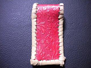 表面は、素地のレザーに、花柄の模様だけを残し、ワインレッドのカラーで、染めた加工のレザーを使用しています。 内側は、メタル系レッドのレザーを使用しています。 ケース周囲は、ガンメタリックのレザーで、かがりをして、仕上げました。 |