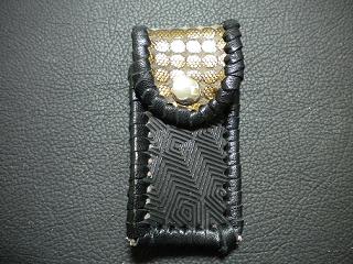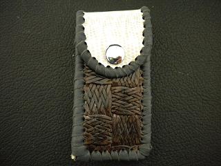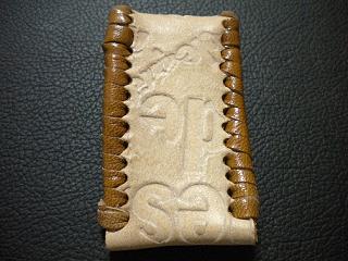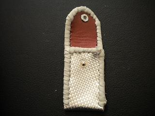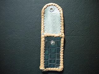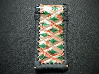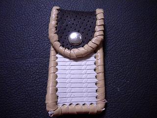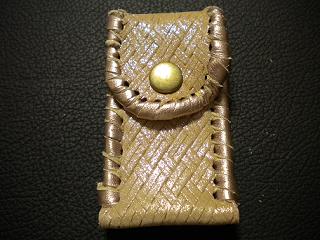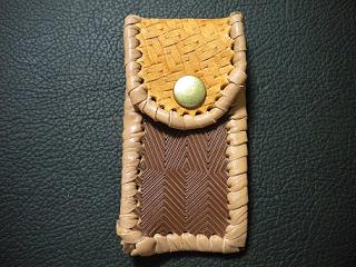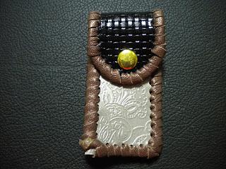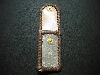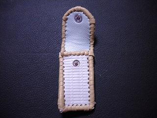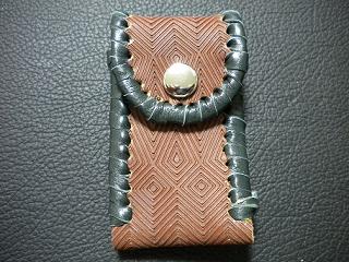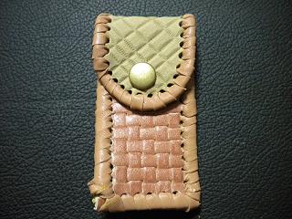 | 説明 | 表面は、幾何学模様の型押しブラウンレザーを使用しています。 内側は、編み込みデザインを型押しをしたアイボリーのレザーを使用しています。 このレザーは、表面に、シルバーラメ加工が施してあるものです。 ケースの周囲は、濃いグリーンのレザーで、かがり仕上げをしました。 |