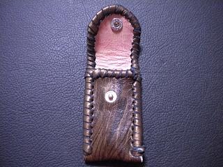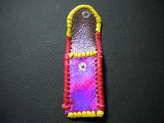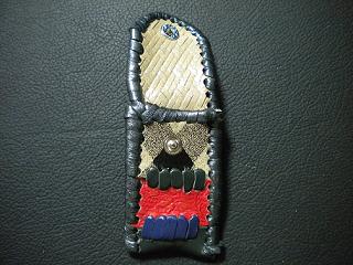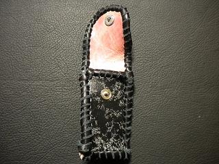 表面の正面側は、バタフライデザインをブラックレザーに型押した、ブラックレザーを使用したいます。 表面の蓋から後ろ側にかけては、レッドスネークデザイン型押しのレザーを使用しています。 ケース内側は、ピンクのカラーが入った、レッドレザーを使用しています。 周囲の部分は、ブラックレザーで、かがりをして、仕上げました。 |