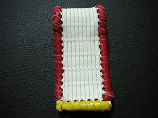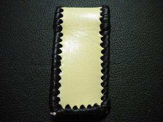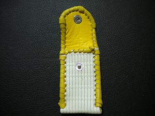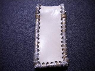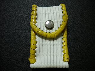 表面は、等間隔に溝のあるデザインを型押しをした、ホワイトレザーを使用しています。 内側は、イエローレザーを使用。 ケース周囲は、濃いイエローレザーで、かがりをして仕上げています。 |