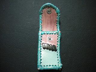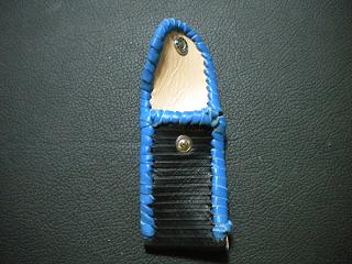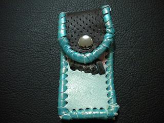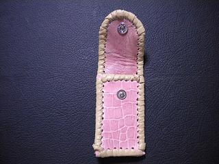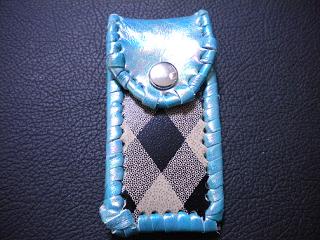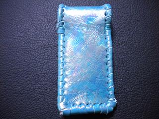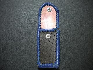 表面は、等間隔に、溝のあるデザインを型押した、ブラックレザーを使用。 内側は、ライトピンクレザーを使用しました。 ケース周囲は、オーシャンブルーのレザーで、かがり仕上げをしています。 |