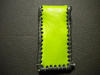 表面は、グリーンレザーを使用しています。 内側と周囲のかがりは、グレーレザーを使用して、仕上げています。 |