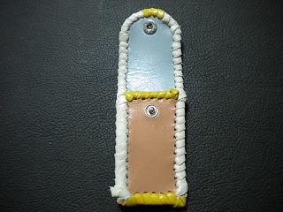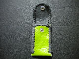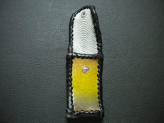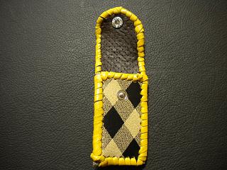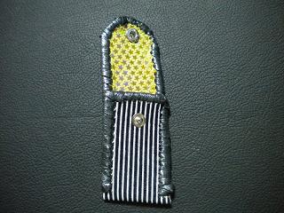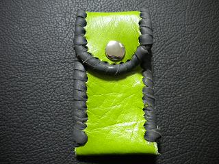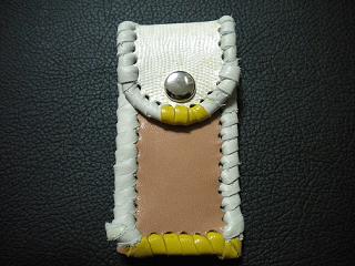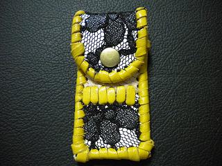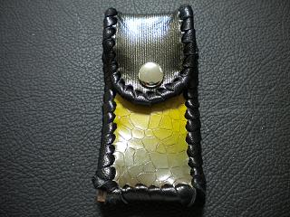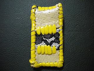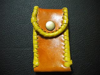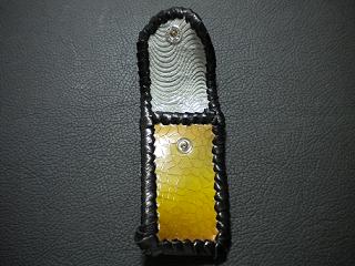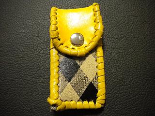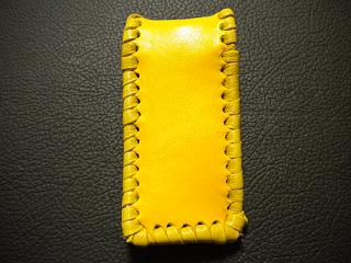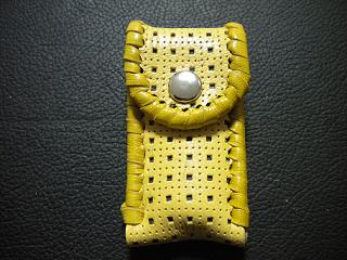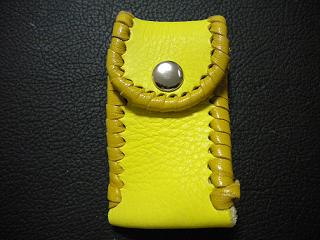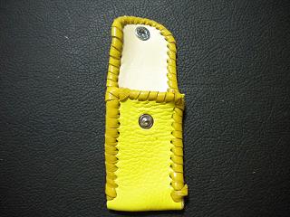 表面は、レモンイエローのレザーを使用しています。 内側は、ホワイトクリームのレザーを使用。 ケースの周囲は、イエローレザーで、かがりをして、仕上げました。 |