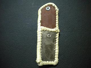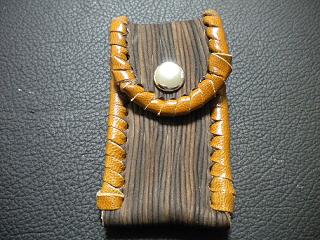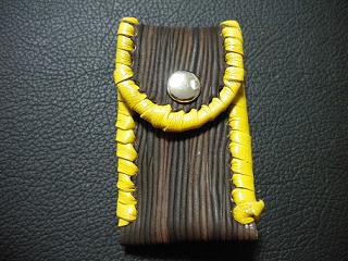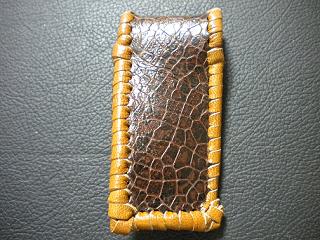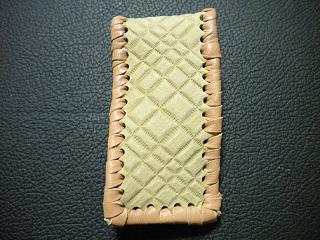 表面は、樹皮のようなデザインを型押しをしたレザーを使用しています。 内側は、和紙ようなデザインのイエローレザーを使用しました。 ケース周囲は、ライトブラウンのレザーで、かがりをして仕上げました。 |