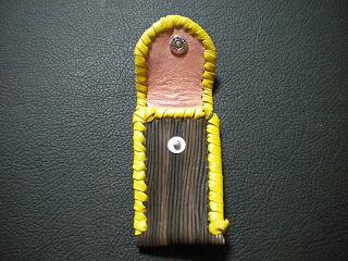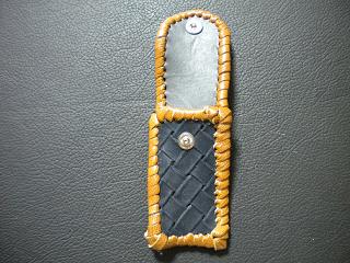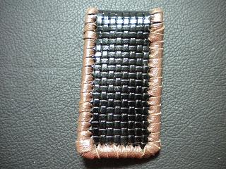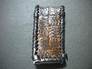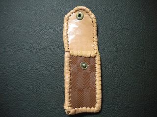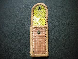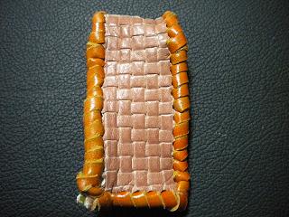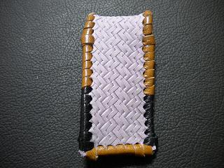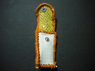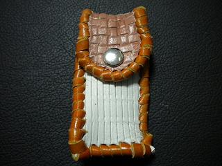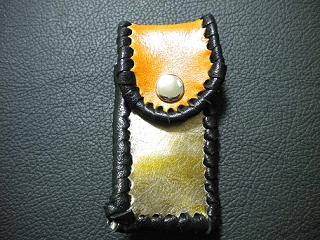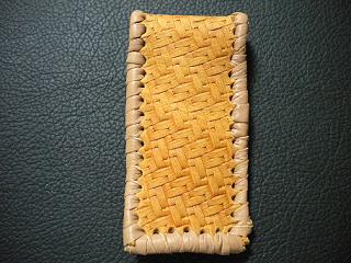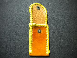 表面は、オレンジブラウンのレザーを使用しています。 内側は、籐細工のような編み込みデザインを型押しをしたオレンジブラウンのレザーを使用しています。 ケース周囲は、濃いめのイエローのレザーで、かがり仕上げをしました。 |
