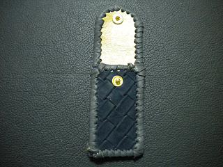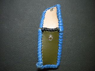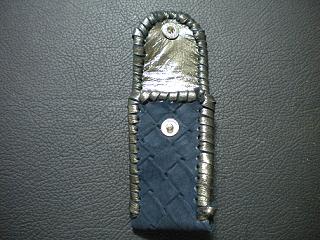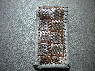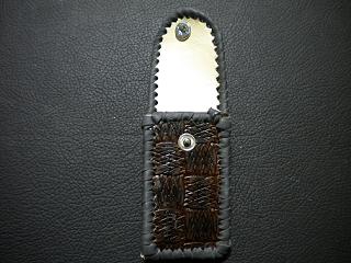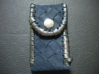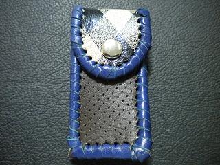 | 説明 | 表面は、編み込みデザインを型押しをした、ダークブルーレザーを使用しています。 内側と周囲のかがりは、等間隔に細い溝の入ったデザインを型押しをした、ガンメタリックレザーを使用して、仕上げました。 |