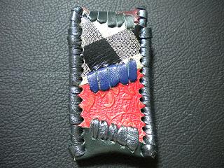 表面のレザーは、カットした4種類のレザーをレザーで、かがりをしてつなぎ、パッチワーク調にしています。 レザーパーツは、@細かい線の入った、型押しガンメタリック、Aアルミカラーのレッド、B編み込みデザインを型押しをした、ダークブルー、C細かい四角で、チェック柄を表現した、型押しシルバーの4種類です。 各パーツは、@ブラック、Aメタルブルー、Bゴールド、Cグレーメタリックの4種類のレザーで、かがりをして、つなげています。 ケース内側は、ライトグレーのレザーを使用しました。 ケース周囲は、グレーレザーで、かがりをして、仕上げました。 |