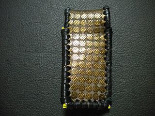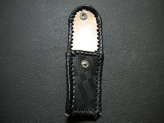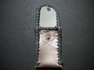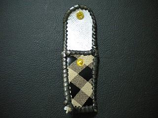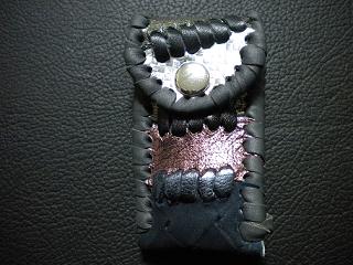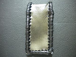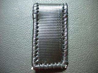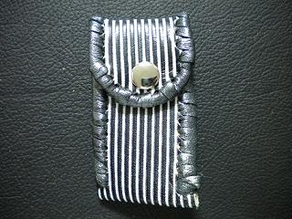 表面は、ブラックベースに、グレーメタリックの斑点デザインのレザーを使用。 内側は、シルバーベースに、ホワイトメッシュのクロスデザインを型押しをした、レザーを使用しています。 ケース周囲は、ライトブラウンのレザーで、かがり仕上げをしました。 |