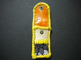 表面は、大きい四角と小さい四角を使って、四角を構成したデザインをパンチング加工した、イエローレザーを使用しています。 このレザーの裏には、穴の陰影を付けるのに、グレーレザーを貼りつけています。 内側は、和紙のような表面デザインのイエローレザーを使用しました。 ケース周囲は、イエローレザーで、かがりをして仕上げました。 |