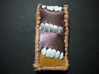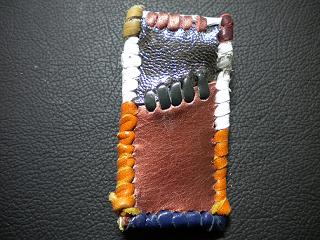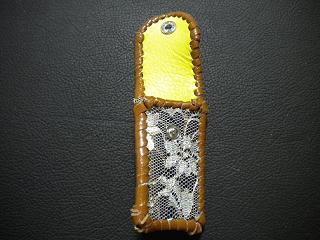 | 説明 | 表面は、2種類のレザーパーツ端部をかがりで、つなげてパッチワーク調にしています。 1枚は、ホワイトレザーをベースに、花柄ブラックレース生地を貼りつけ加工してあるもの。 もう1枚は、編み込み柄を型押しをしたライトベージュのレザーを使用しています。 ケース内側は、オレンジブラウンのレザーを使用しています。 表面レザーのつなぎとケース周囲のかがりは、濃いイエローレザーを使用しました。 |