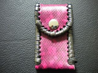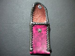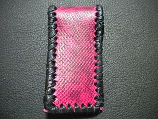 表面は、レッドピンクのスネーク柄型押しのレザーを使用しました。 内側は、淡い発色感のワインレッドレザーを使用しました。 周囲の部分は、等間隔で細い溝を型押しをした、ガンメタリックレザーで、かがりをして、仕上げています。 |