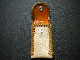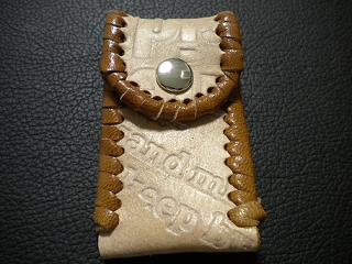 表面は、素地のレザーに、英字のデザインを型押したレザーを使用しています。 内側は、オレンジブラウンのレザーを使用。 ケース周囲は、ライトブラウンのレザーで、かがりをして、仕上げました。 |