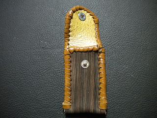 | 説明 | 表面の正面側は、1センチ幅のレザーを編み込んだようなデザインを型押しした、ライトブラウンのレザーを使用。 表面の蓋から、後ろ側にかけては、カーキのレザーを使用しています。 内側は、トカゲ柄を型押しをしたブラックレザーを使用しました。 ケース周囲は、濃いめのカッパーのレザーで、かがり仕上げをしています。 |