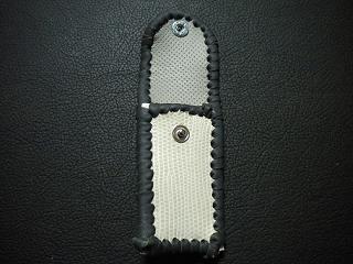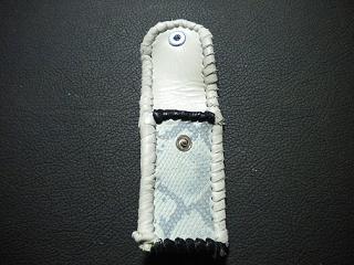 表面の正面側は、ホワイトトカゲデザインを型押しをした、レザーを使用しています。 表面の蓋から、後ろ側にかけては、細いラインを型押しをした、ブラックメタリックレザーを使用。 内側は、ライトグレーパンチングレザーを使用しました。 周囲の部分は、グレーレザーで、かがりをして、仕上げました。 |